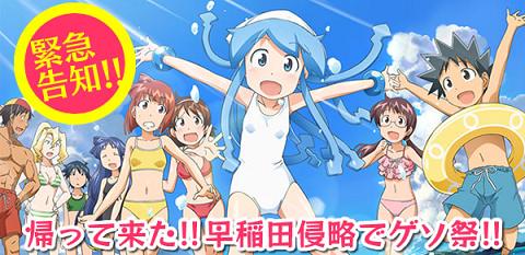 2011年、早稲田大学の学園祭を侵略した「侵略!イカ娘」が、2012年も再び!チケットは10月22日(土)から販売開始!昨年見逃した方、今年もまたチャンスです!!今回は、文化放送で絶賛放送中の『金元寿子×イカ娘 侵略ラジオ!?聞かなイカ!?』の公開録音やお楽しみ抽選会などを実施。ゲストも公録ではお馴染みの相沢たける役大谷美貴さん、斉藤渚役片岡あづささんに加え、今回イベント初参加の紗倉清美役・菊池こころさんが出演という、昨年よりボリュームアップした内容となる模様。また現在TVアニメ第2期も放送中ということで、とっておきの情報などが飛び出すかも!?