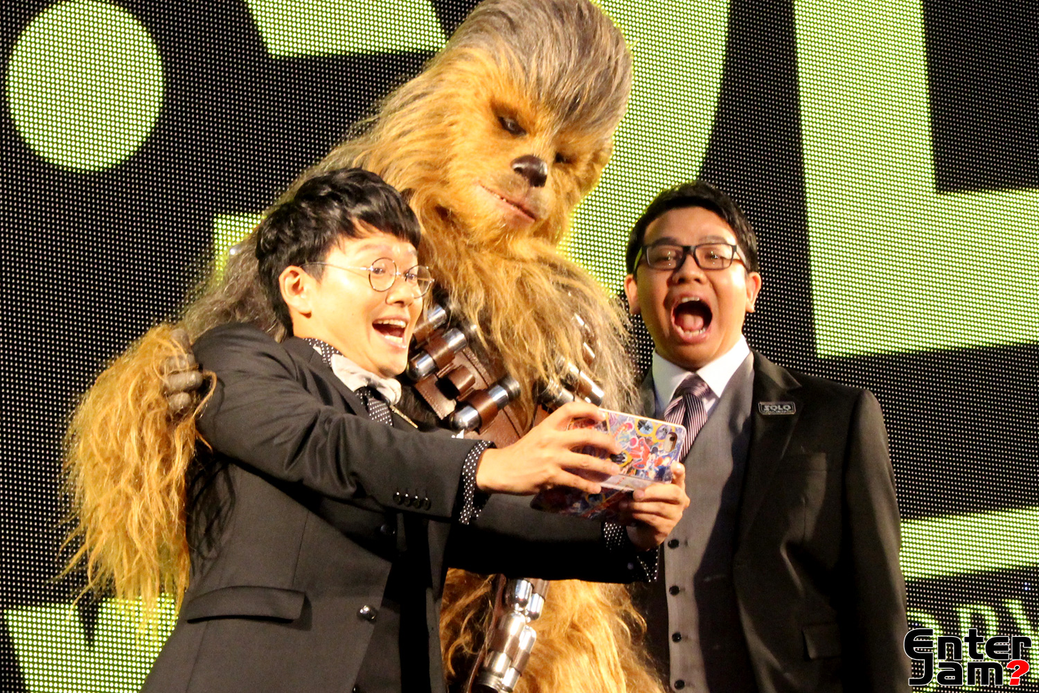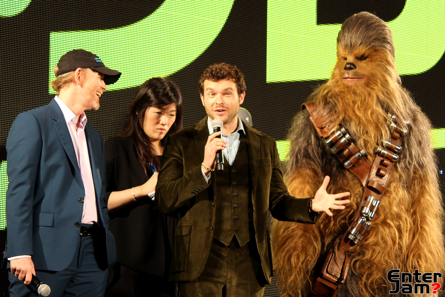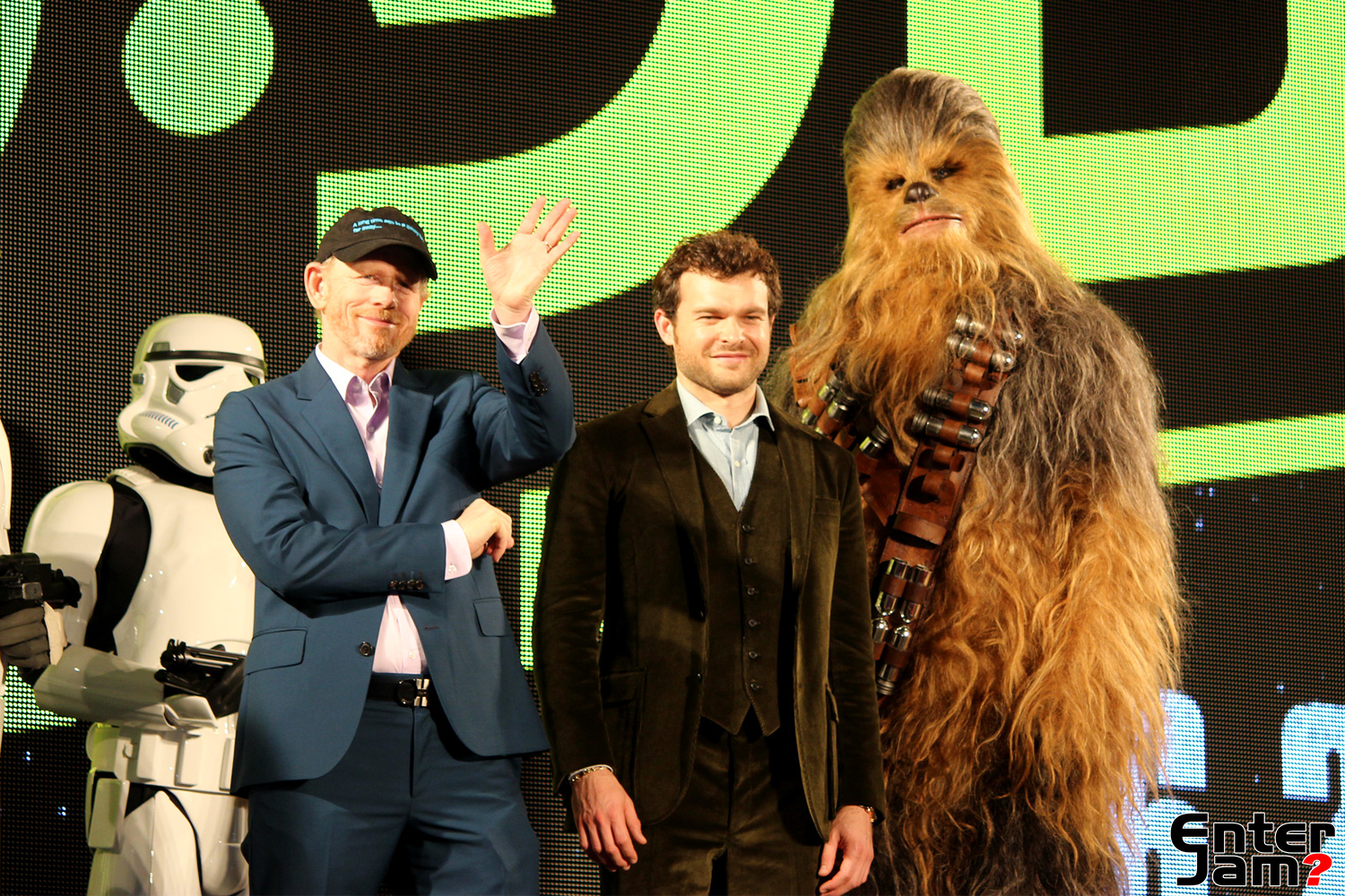 続いてステージイベントに入ると、ロン監督、オールデン、チューバッカと共に帝国軍のシンボルストーム・トルーパー達も登壇して会場も華やかな空気に包まれた。オールデン「初めて日本に来れて本当に良かったです、是非映画を楽しんでください」と初来日の喜びを話し、ロン監督は「本当に日本が大好きで来日するたびに楽しい国です。日本は映画に対してとても熱い魂を持った人たちがいて、そういった中で最後のプロモーションの地を訪れることが出来て、かつ新しい『スター・ウォーズ』の誕生を分かち合えて嬉しいよ」とファンを喜ばせるメッセージを送った。またチューバッカも歓喜の雄叫びを上げたがこれをオールデンが「とても喜んでいるね、会場のチューイにも挨拶したいみたいだ」と翻訳するユーモアあふれる一面をみせた。