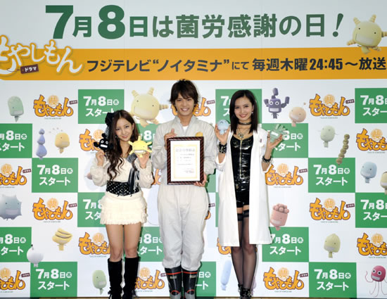 現在「イブニング」(講談社)で大人気連載中、累計発行部数450 万部突破の大人気コミック『もやしもん』。2007 年には同枠でアニメ化され、菌が肉眼で見える主人公・沢木惣右衛門直保を中心に “農大で菌とウイルスと少しばかりの人間が右往左往する物語”として大きな話題を呼んだ本作が、7 月8 日(木)よりフジテレビ“ノイタミナ”ほかにて放送、“ノイタミナ”初の実写作品として話題となっている。放送スタートを翌日に控えた7 月7 日(水)、フジテレビ湾岸スタジオにて記者会見が開催された。