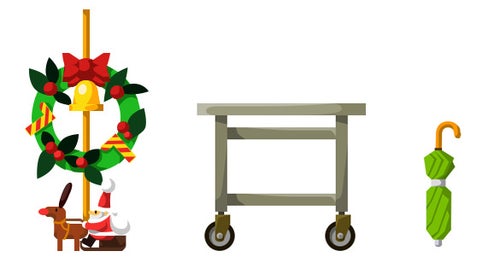クリスマスシーズンにぴったりの「サンタクロース」の飾り、日常生活で役立つ車輪が付いた「ワゴン」や小さな「オリタタミガサ」など、さまざまなモノが確認できる。