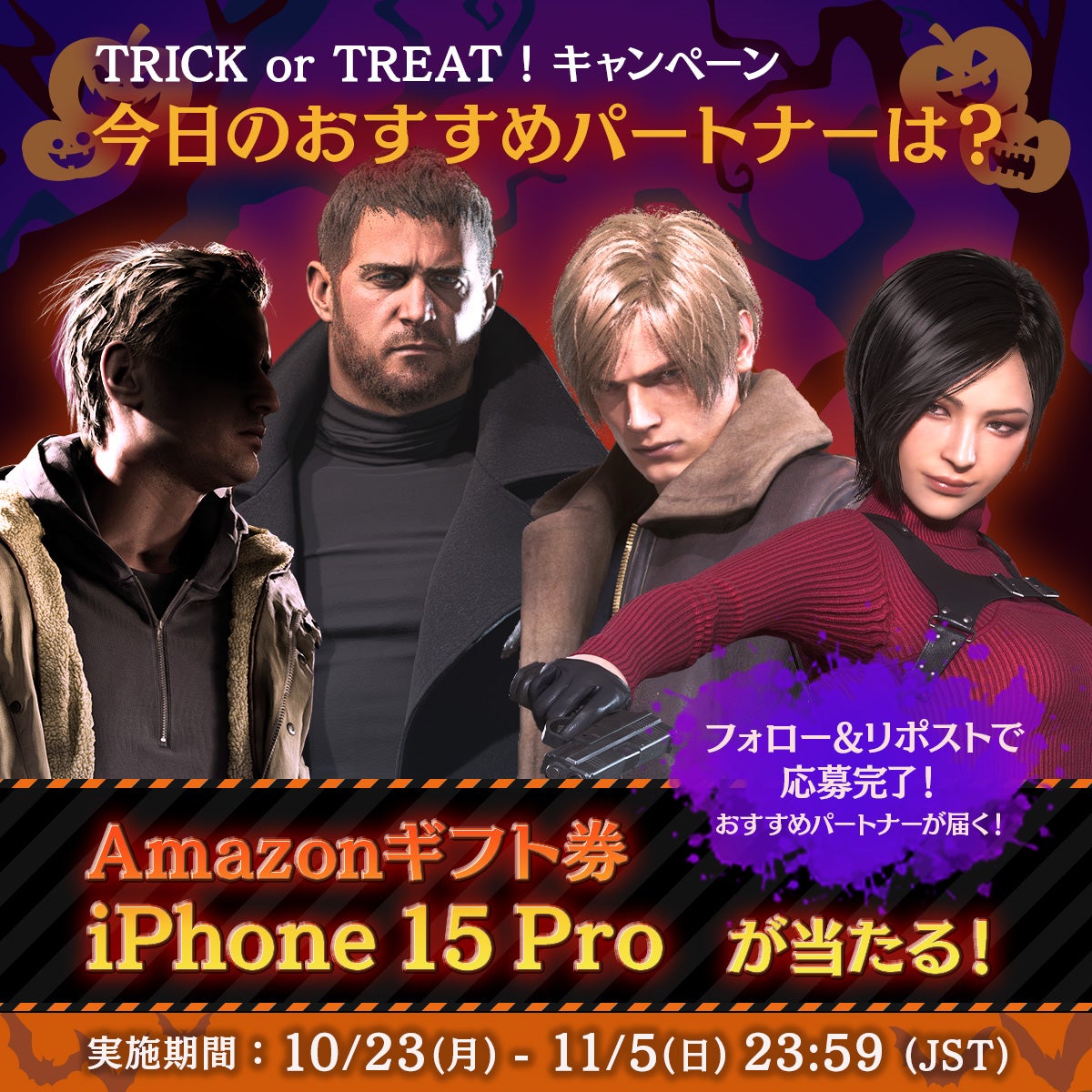 「バイオハザード」ブランド公式X(旧Twitter @REBHPortal)にて、10月23日(月)より、『TRICK or TREAT! キャンペーン』を開催! ハロウィンの合言葉「トリックオアトリート」にちなんで、10月23日(月)より、キャンペーン対象投稿をリポストするとお菓子…ではなく「バイオハザード」シリーズキャラクターの中から【今日のおすすめパートナー】の画像をリプライでお届けする『TRICK or TREAT! キャンペーン』をX(旧Twitter)上で開催します。このキャンペーンは抽選でAmazonギフト券(総額10万円分)がその場で当たるチャンス付き。キャンペーン期間中は毎日1回ずつ参加できるので、その日の運試しも兼ねてチャレンジしてみてくださいね。また、iPhone/iPad版『バイオハザード ヴィレッジ』発売を記念し、ご参加いただいた方の中から抽選で1名様に iPhone 15 Proをプレゼント!皆さまのご参加をお待ちしております。■キャンペーン期間2023年10月23日(月)~11月5日(日)23:59■参加方法1. バイオハザード / RESIDENT EVIL PORTAL Official Xアカウント( https://x.com/REBHPortal )をフォロー2. 対象投稿をリポストすることで応募完了となります。■賞品賞品1:iPhone 15 Pro 1台※日本語および英語ポストから応募頂いた方の中で1名様に付与します。賞品2:Amazonギフト券 コードタイプ 1,000円分(日米賞品総額最大10万円分)※日本語ポスト(ツイート)からご応募いただいた当選者には日本版Amazonでのみ使用可能なギフト券を、英語ポスト(ツイート)からご応募いただいた当選者にはアメリカ版Amazonでのみ使用可能なギフト券を付与します。(それ以外の国・地域向けのAmazonではご使用いただけませんのでご注意ください。)■応募規約URL: https://game.capcom.com/residentevil/ja/news-3510.html■ブランドサイト「バイオハザード ポータル」URL: https://game.capcom.com/residentevil/ja/■関連情報バイオハザード / RESIDENT EVIL PORTAL Official @REBHPortal https://x.com/REBHPortal