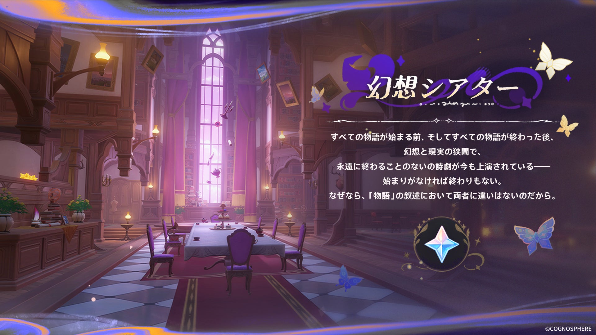 モンド図書館のとある不思議な部屋から挑戦できる「幻想シアター」には、異なる難易度の戦闘挑戦が用意されており、挑戦中は様々なバフやデバフを受けることになります。本秘境には特定の元素タイプのキャラクターと一部例外のキャラクターのみが出場でき、各キャラクターの出場回数には制限があります。出場キャラクターは、所持キャラクターのほかに、予め用意される6名の初期編成キャラクター、フレンドから派遣された「サポートキャスト」、数名の「特別招待キャスト」から選んでチームに編成することが可能です。また「幻想シアター」の実装に伴い、現行の深境螺旋は毎月16日に更新されるようになります。