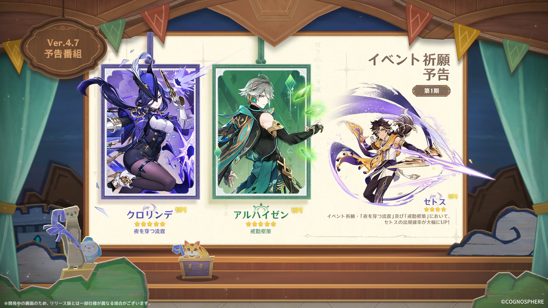 またVer.4.7では、「アルハイゼン」と「フリーナ」が復刻登場予定です。イベント祈願前半では、「クロリンデ」「セトス」「アルハイゼン」が登場し、後半では、「シグウィン」「フリーナ」が登場します。