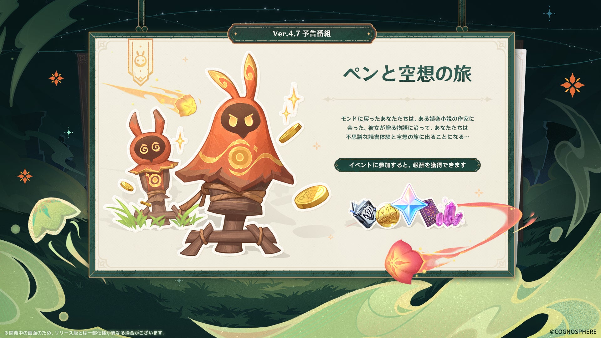 株式会社COGNOSPHERE(本社:東京都渋谷区、代表取締役社長:李 承天)は、HoYoverseが配信するマルチプラットフォーム対応オープンワールドRPG『原神(げんしん)』において、Ver.4.7「永き夢を紡いで」が6月5日(水)にリリースされることを発表しました。新キャラクターや、開放予定の新任務や長期開放コンテンツ、開催予定の新イベント情報、そして新たな国「ナタ」に関する最新映像の公開などをお知らせいたします。