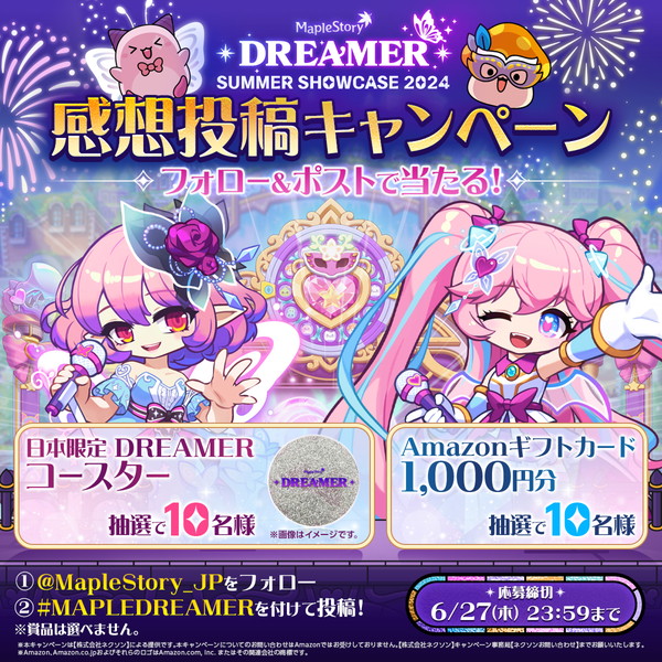 『メイプルストーリー』公式X(@MapleStory_JP)をフォローし、指定のハッシュタグをつけて、生放送へのご感想や、「DREAMER」アップデートへのコメントなどをご投稿ください。投稿いただいた方の中から抽選で、日本限定の「DREAMERコースター」やAmazonギフトカード1,000円分をプレゼントいたします。