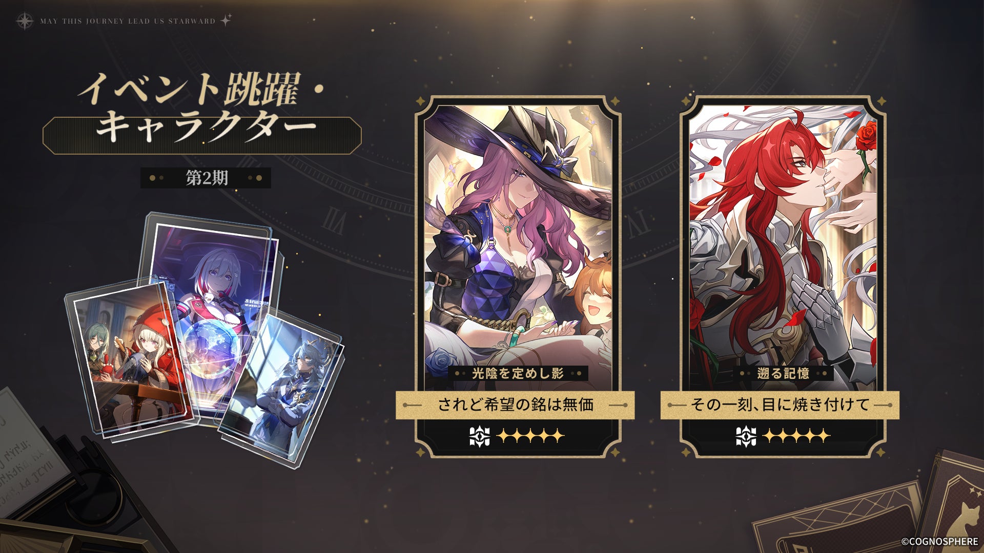 同時開催のイベント跳躍・光円錐「光陰を定めし影」では、限定星5光円錐「されど希望の銘は無価(知恵)」の出現率がアップ!そして「遡る記憶」では限定星5光円錐「その一刻、目に焼き付けて」が再び登場!
