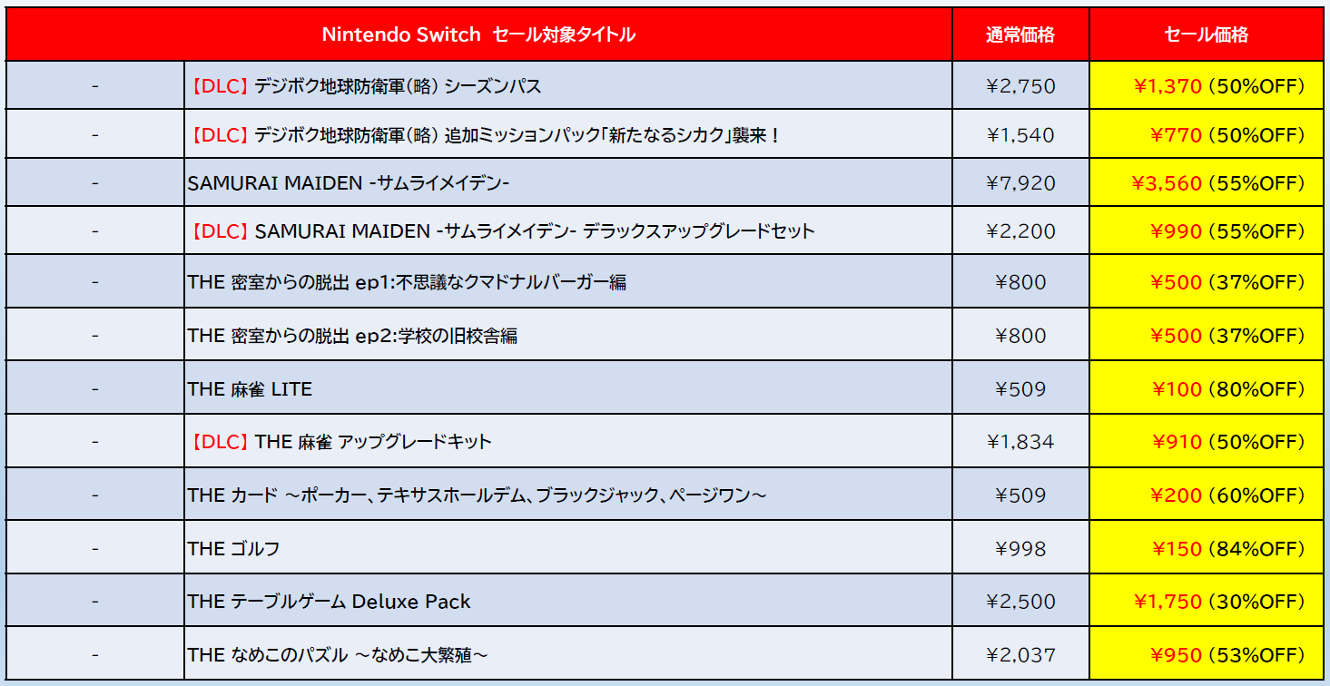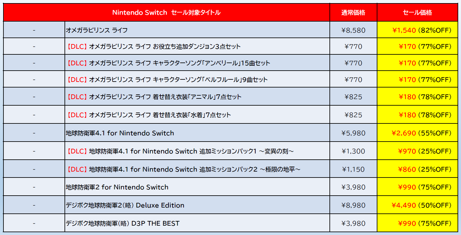 『地球防衛軍4.1』ゲーム本編と追加ミッションパックが大幅値引き。 さらに『オメガラビリンス ライフ』ゲーム本編と追加ダンジョンセットなどの人気DLCが大特価セール! 他にも『あのゲー1+2』『アイ★チュウ』など、厳選Nintendo Switchソフトが超お買い得な冬の大幅割引セール実施中!この機会をお見逃しなく!