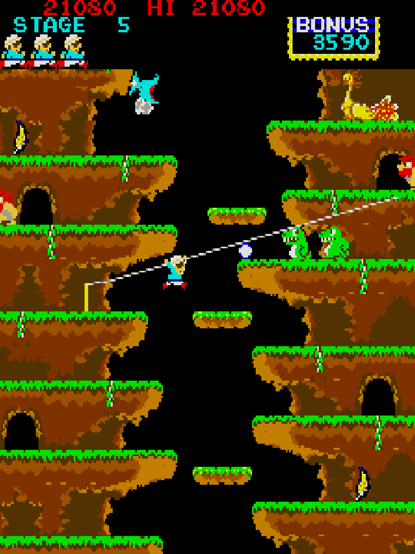 『ロックンロープ』は、1983年にKONAMIから発売されたアクションゲーム。プレイヤーは幸運の鳥「ロック鳥」を追い求め、断崖や氷の洞窟といった多彩なステージを上へ上へと進んでいく。