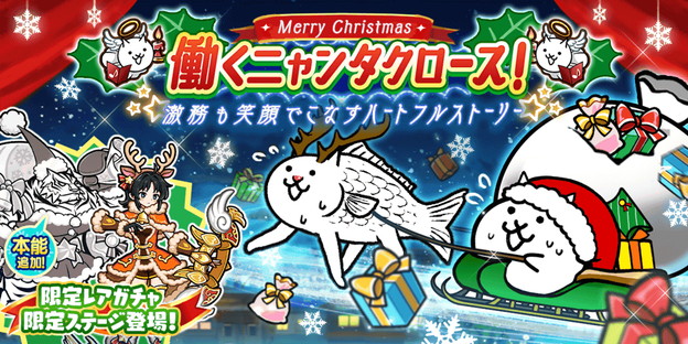 ポノス株式会社(本社:京都府京都市、代表取締役:辻子依旦、以下ポノス)は、スマートフォン向けゲームアプリ『にゃんこ大戦争』において、期間限定イベント「働くニャンタクロース!」を2025年12月15日(月)11:00より開始した。