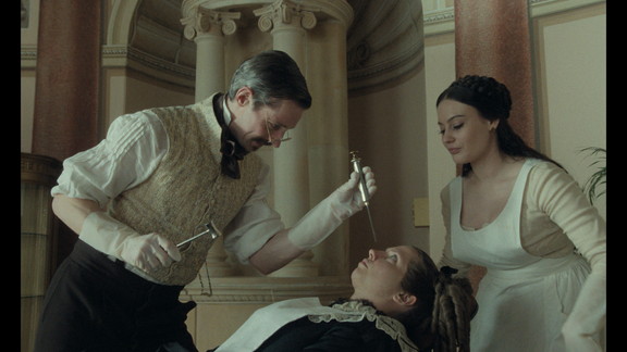 二つ目はデカ目にするための施術。医師の「ゴージャスな美女になる」という言葉の後、麻酔なしで瞼に直接、針と糸でつけまつ毛が縫い付けられる。白濁した瞳で見つめる看護師の姿と、エルヴィラの苦悶のうめきが不気味な緊張感を生む。