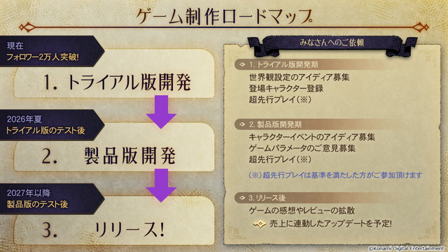 KONAMIが主導する共創プロジェクトです。ゴールはみんなでゲームを完成させる事!その過程からみなさんが関わっていく事ができます。ルールを守ればIPの商用利用もOK!誰でもコンテンツの創作に自由に参加することができます。