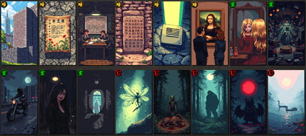 「口裂け女」「ひとりかくれんぼ」「切り裂きジャック」など、古今東西の都市伝説や陰謀論がドット絵カードとして登場する。