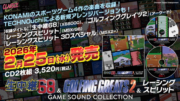 株式会社シティコネクションは、2026年2月25日(水)、ゲーム音楽レーベル「クラリスディスク」より音楽CD**『生中継68 & ゴルフィンググレイツ2 & レーシングスピリット GAME SOUND COLLECTION』**を発売することを発表した。