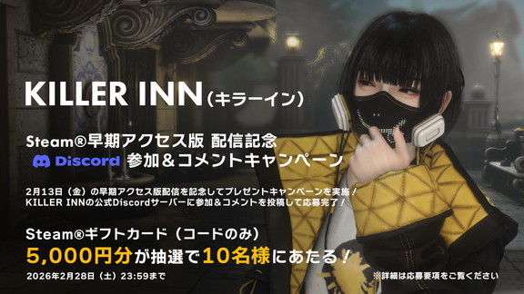 株式会社スクウェア・エニックス(本社:東京都新宿区、代表取締役社長:桐生隆司)は、2026年2月13日(金)より、**Steam®にてマーダーミステリーアクションゲーム『KILLER INN』(キラーイン)**の早期アクセス版を配信開始したことを発表した。