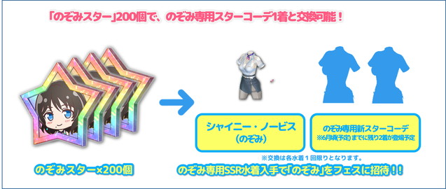 また、有償Vストーンによる10連ガチャのおまけとして**「のぞみスター」10個**が付与され、「のぞみスター」を200個集めることで、のぞみ専用SSR水着1着と交換が可能。