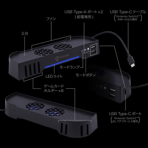 さらに、3段階(強・中・弱)の風量調節機能やLEDライトのオン・オフ機能も搭載。長時間プレイ時の熱対策や、ハードを最適な環境で維持したいユーザーに向けた製品となっている。
