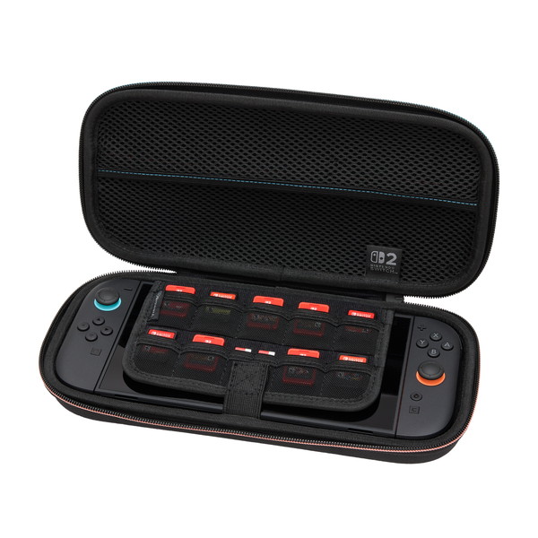 外側には耐久性の高いPU素材を使用し、内側には起毛素材を採用。本体にフィットする設計で、キズや汚れから保護する。ゲームカード最大9枚、microSD Expressカード最大2枚を収納可能。収納ポケット裏にはパッドを備え、画面保護にも配慮されている。
