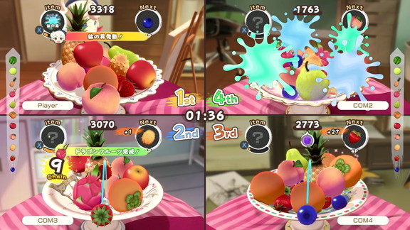 ビサイドが自社IPとして展開する対戦型3Dマージパズルゲーム。フルーツを皿に投げ入れて積み上げ、同じ種類同士が触れると合体してより大きなフルーツへ——「スイカゲーム」系のシンプルなルールに、最大4人同時対戦とアイテムを駆使した戦略的な駆け引きを加えたパーティーゲームである。