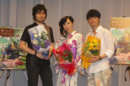 たくさんの応募の中から、抽選で選ばれた「夏雪ランデブー」ファンが駆けつけた中、中村さん、大原さん、福山さん、が登壇すると、会場からは大きな歓声が起こった。この日、夏らしく浴衣姿で登場した大原さんは、司会からの「作品のイメージに寄せて浴衣なんですか?」という質問に「全然関係ないです。(笑)でも、お花柄はちょっと意識しましたね。」とコメント。すかさず、福山さんから「大原さんは気合が入っているときは、浴衣なんです!」とツッコミが入り、和気あいあいとした雰囲気でトークショーがスタート。